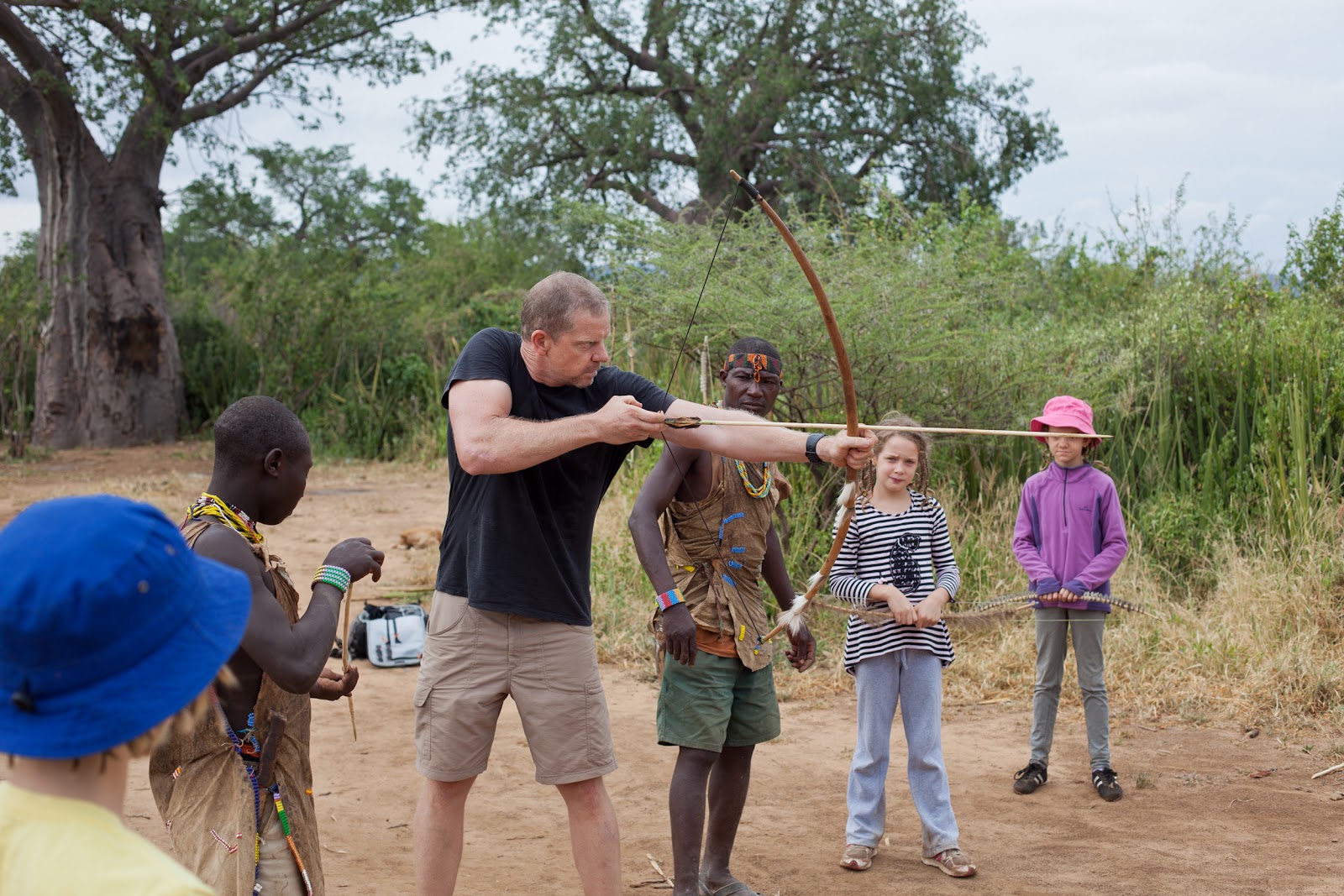 It was now 8.30 so we started back the way we came. We saw dikdik footprints, but no animals. We walked past another tribes’ hut, and it was odd how the Hadza walked past without any acknowledgement. The baobab and flat top acacias provided a quintessential African scene. We found some porcupine quills on the ground, and a couple of Franklin bird eggs.  Our guide pointed them out, and the Hadza wanted to take them, but he admonished them. He thought they should be left to grow into birds – better eating if nothing else. He said to Charlie afterwards that the ‘Hadza have no future.  They think only of today’. Back at the camp, another dikdik and a rabbit were now hanging and drying, and the men prepared to demonstrate their archery target practice. Then Charlie and the kids had a turn. Charlie hit the target on his 3rd shot, and each of the kids got pretty close. Apparently, women don’t get to try.