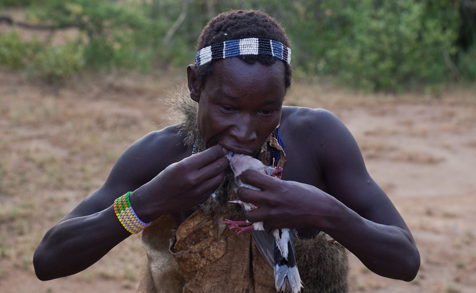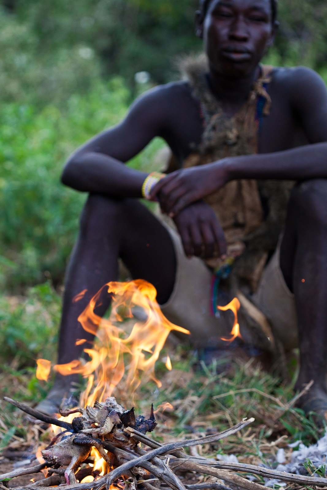 We had an early start today, with coffee on our doorstep at 5:15am before leaving at 5:30 am to get the the local Hazda tribe. We arrived in the pre dawn gloaming, and walked trough the scrub to get to the tribesmen. They were crouched down around the fire, preparing their morning smoke (marijuana), and tidying their arrows. One man brought out yesterday’s dikdik and proceeded to gut and skin it. It was a small female, and was in fact pregnant – we were shown the foetus before it was given to a couple of the scrawny hunting dogs. The innards were mostly hung out to dry, as was the carcass and the skin, whilst the head and a few other pieces were put in the fire for pre hunt sustenance. There were around 6 men here, then we were taken around the corner to the 6 or so women in the group. They were also crouched around a fire and preparing for their day. They forage, and provide about 90% of the food for the group.