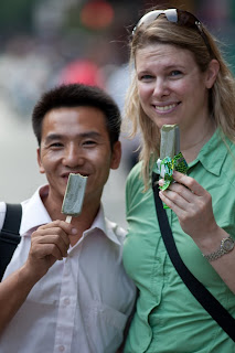 We are enjoying our quieter day, with an afternoon of resting and washing, then exploring the tourist town of Yangshuo. We are finally seeing some westerners here, mostly in pairs on backpacking holidays, and the market stall holders are pushier in plying their wares. A treat that had to be sampled was their Green Bean flavoured icecream! It was a dull green color (like overcooked green beans), but had a kind of herbal tea flavour. Not bad, but not gonna replace chocolate icecream on my list of favourites.